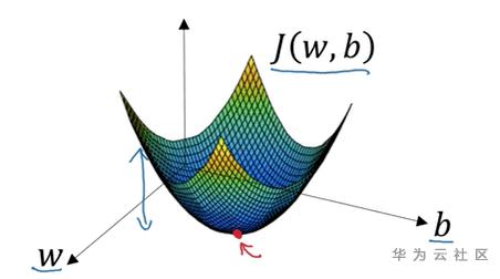 因此可以模拟一个表达式的图形如下,其中Z轴是J,如图可知,我们要做的事,就是在这个图上找到最低点,则表示的就是J(w,b)的最小值