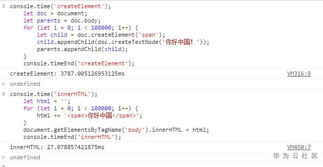 可以看到,在创建10万span元素的情况下,createElement和innerHTML的效率差别,简直是天上地下,所以呢: