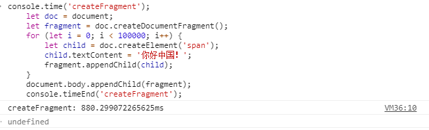 可以看出,效果不错,为什么呢,因为文档片段存在于内存中,并不在DOM树中,所以将子元素插入到文档片段时不会引起页面回流(对元素位置和几何上的计算)。因此,使用文档片段通常会带来更好的性能。