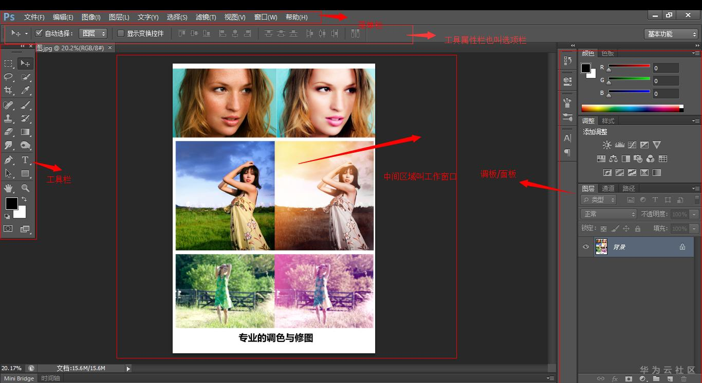 菜单栏、选项栏、工具栏、浮动面板(拖拽名称,可单独操作面板)、绘图窗口 窗口菜单,可显示隐藏所有面板