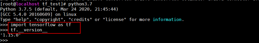 2、调用python3.7.5环境验证tensorflow模块可调用,能够成功返回tensorflow版本,即可判断tensorflow已可调用:
