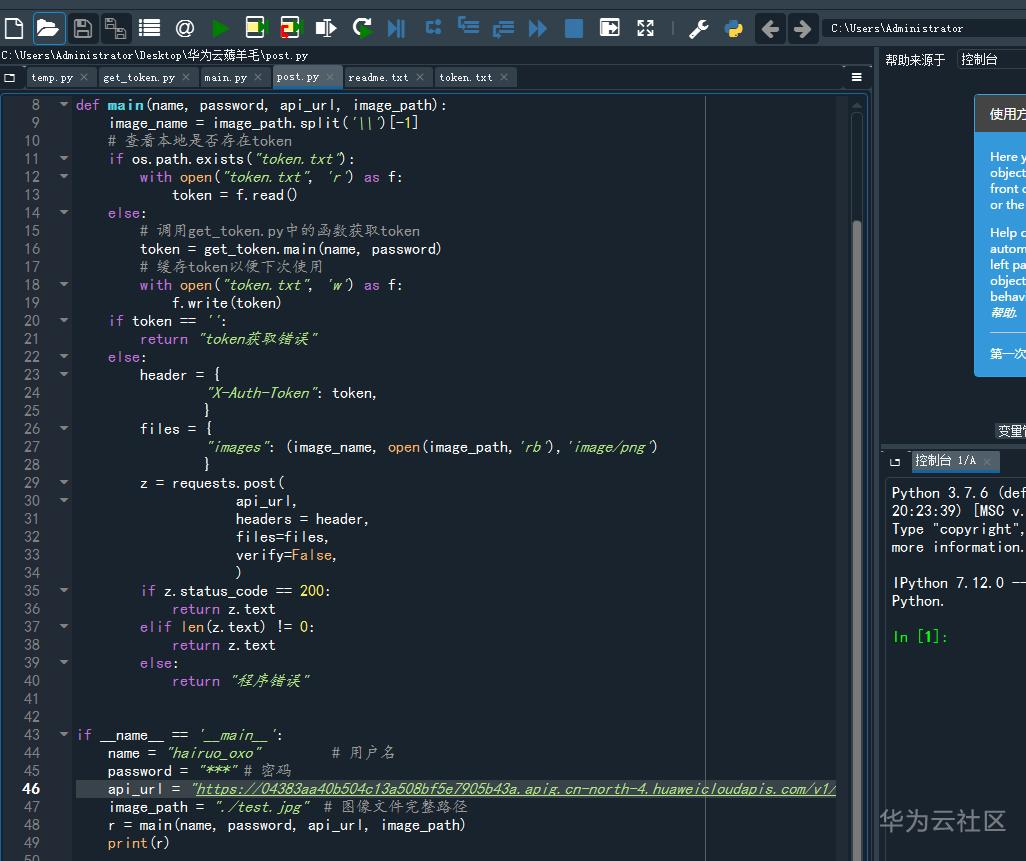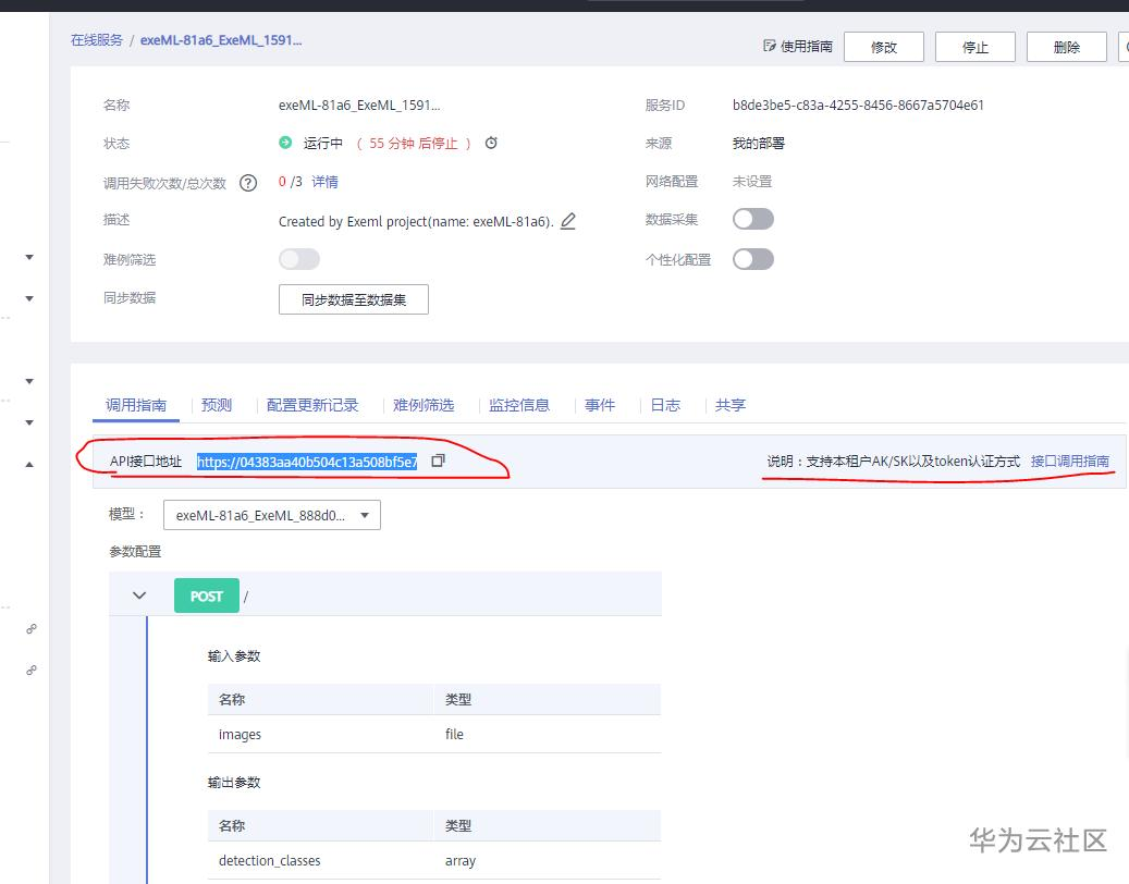 从上图我划出的红线可以看到,当我们在modelarts里边部署成功了一个在线服务后,在调用指南页面下,会出现API的接口地址。如果你不是太懂怎么调用API的话,请仔细阅读接口调用指南,我就是参考指南一步步尝试的。