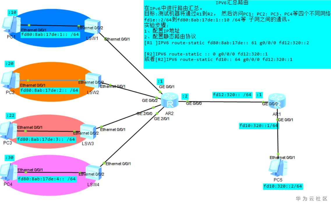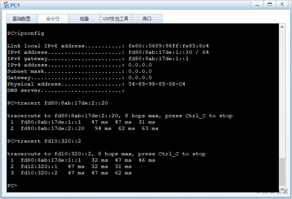 sys sys AR1 IPV6 int g0/0/0 ipv6 en ipv6 add FD12:320::1 64 q int g0/0/1 ipv6 en ipv6 add FD10:320::1 64 q IPV6 route-static fd80:8ab:17de:: 61 g0/0/0 fd12:320::2 A->B汇总路由
