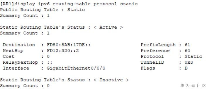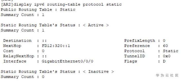 display ipv6 routing-table protocol static //查看静态路由
