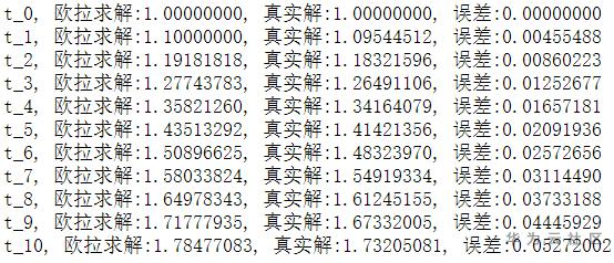 可以看出,欧拉解与真实解之间是由误差的,随着t时刻的增加,误差不断积累,所以也有一些校正的方法提出来,这里不做介绍。