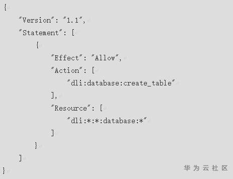 { "Version": "1.1", "Statement": [ { "Effect": " Allow", "Action": [ "dli:database:create_database", "dli:database:drop_database", "dli:queue:submit_job", "dli:table:drop_table" ], "Resource": [ "dli:*:*:database:*", "dli:*:*:queue:*", "dli:*:*:table:*" ] } ] } |