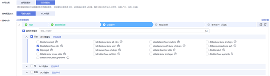 限制条件:使策略生效的特定条件,包括条件键和运算符。条件键表示策略语句的 Condition 元素中的键值,分为全局级条件键和服务级条件键(由云服务定义,请参见云服务帮助中心)。全局级条件键(前缀为g:)适用于所有操作,服务级条件键(前缀为服务缩写,如dli:,目前DLI未提供服务级条件键)仅适用于对应服务的操作。运算符与条件键一起使用,构成完整的条件判断语句。