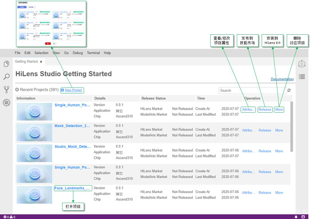 进入Studio后(当前需要先开通公测),即可见到以下界面,与大部分的IDE不同,本Studio为开发者提供项目管理的功能。在这里除了查看已有的项目列表,您还可以新建项目(基于模板)、修改项目属性、发布技能(到技能市场)、安装技能(到HiLens Kit)、备份项目(到对象存储服务OBS)、删除项目等常用必要功能,在此不赘述。