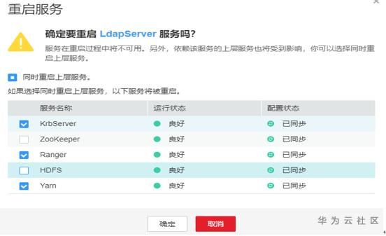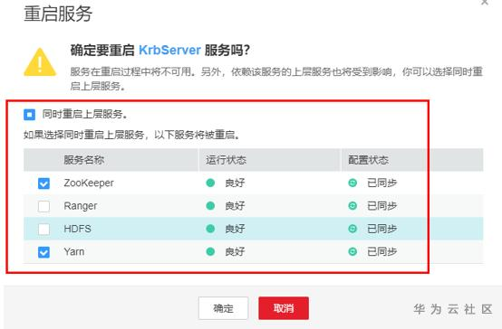 2. MRS Manager 3.0.0 新特性要求在上述功能的基础上,实现自定义启停,即在重启和停止服务时候实现如下融合特性。明显可以看出可以在重启KrbServer服务的上层服务实现勾选YarnZookeeper两个部分服务,而不是全部的上层服务。