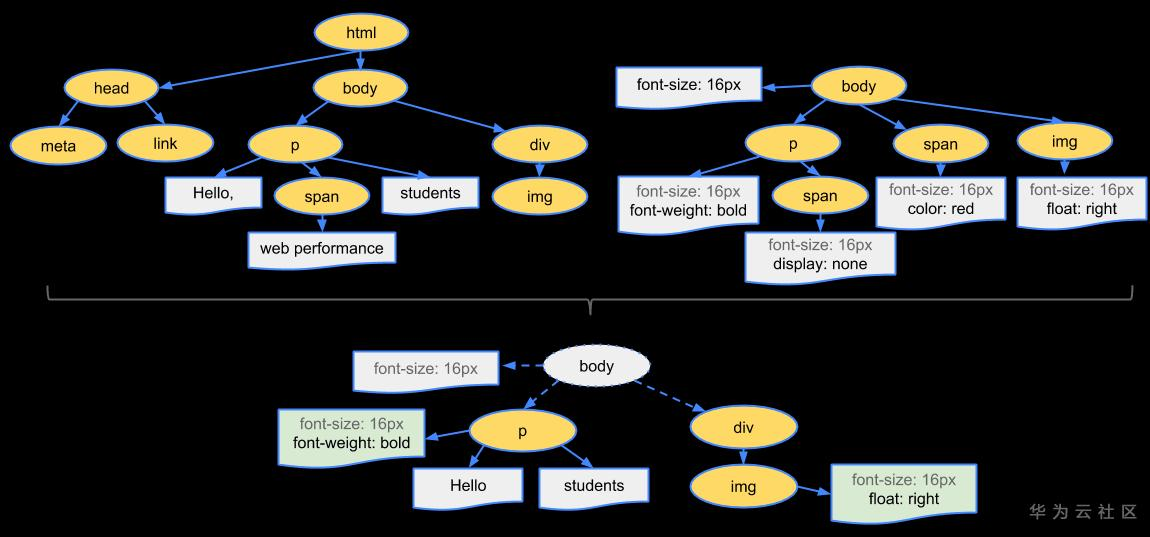 当然把DOM树和样式规则树匹配构建渲染树时,只会把可见元素和它对应的样式规则结合一起产出到渲染树,这就意味有不可见元素,当匹配DOM树和样式规则树时,若发现一个元素的对应的样式规则上有display:none,浏览器会认为该元素是不可见的,因此不会把该元素产出到渲染树上。