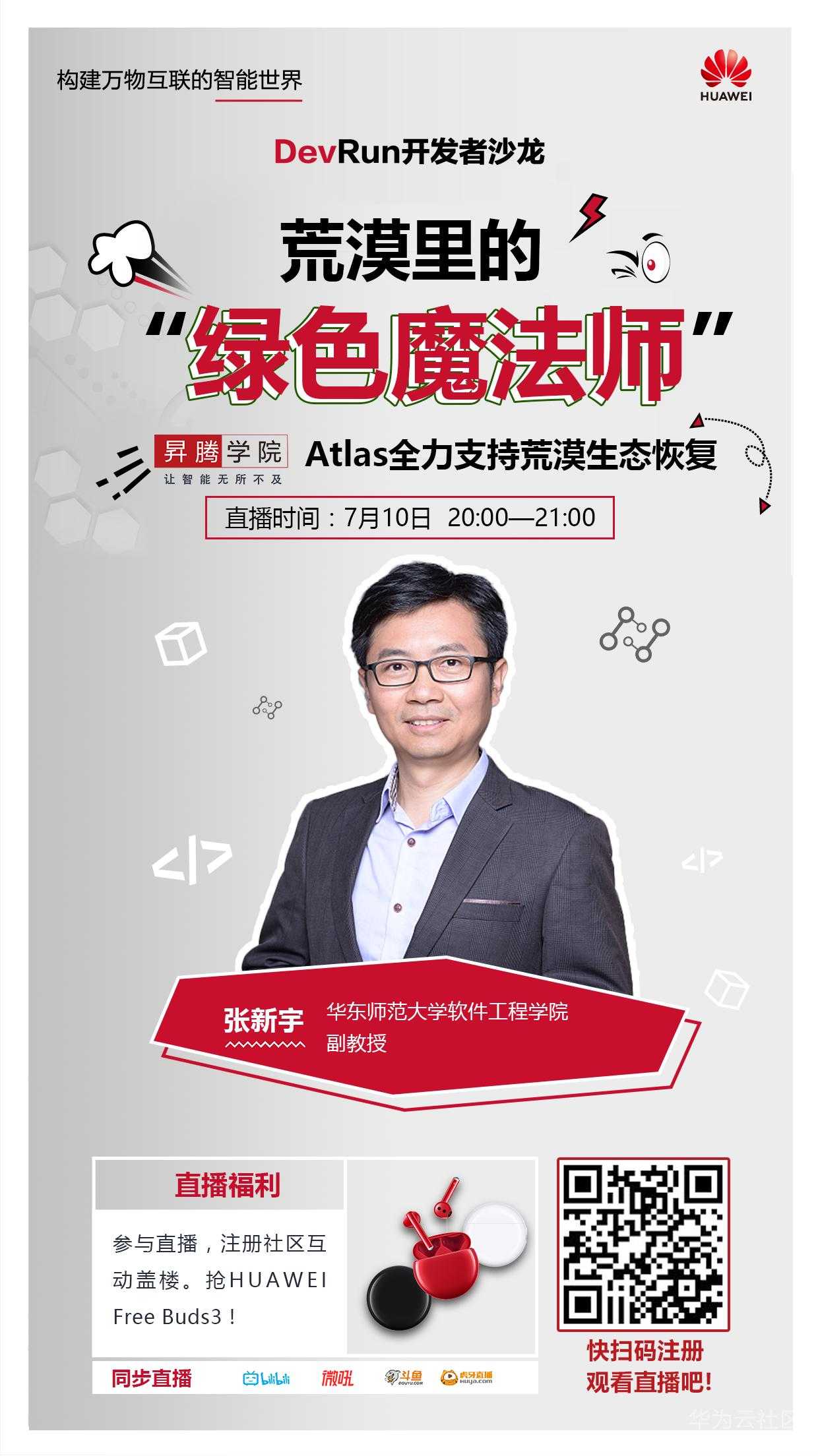 7月10日,最新一期昇腾学院直播,将由华东师范大学软件工程学院的张新宇副教授,为我们带来【Atlas全力支持荒漠生态恢复】的分享!