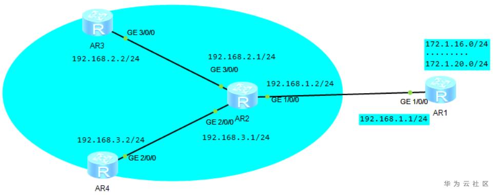 <AR1>sys [AR1]sys AR1 [AR1]int g0/0/0 [AR1-GigabitEthernet0/0/0]ip ad 192.168.1.1 24 [AR1-GigabitEthernet0/0/0]q [AR1]ospf 1 [AR1-ospf-1]filter-policy ip-prefix a2b export static [AR1-ospf-1]import-route static [AR1-ospf-1]area 0 [AR1-ospf-1-area-0.0.0.0]network 192.168.1.0 0.0.0.255 [AR1-ospf-1-area-0.0.0.0]q [AR1]ip ip-prefix a2b index 10 permit 172.1.16.0 24 [AR1]ip ip-prefix a2b index 20 permit 172.1.17.0 24 [AR1]ip ip-prefix a2b index 30 permit 172.1.18.0 24 [AR1]ip ip-prefix a2b index 40 permit 172.1.19.0 24 [AR1]ip ip-prefix a2b index 50 permit 172.1.20.0 24 [AR1]ip route-static 172.1.16.0 255.255.255.0 NULL0 [AR1]ip route-static 172.1.17.0 255.255.255.0 NULL0 [AR1]ip route-static 172.1.18.0 255.255.255.0 NULL0 [AR1]ip route-static 172.1.19.0 255.255.255.0 NULL0 [AR1]ip route-static 172.1.20.0 255.255.255.0 NULL0