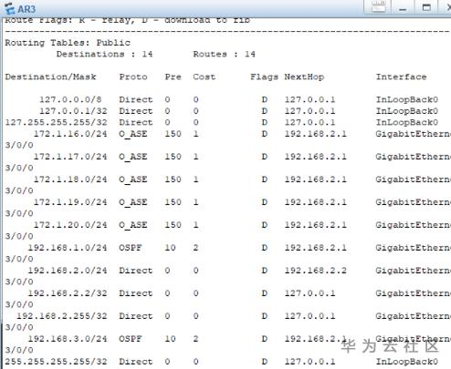 (1)配置路由策略前查看AR3的IP路由表,可以看到AR3的本地核心路由表中,接收了AR2发 送的所有路由