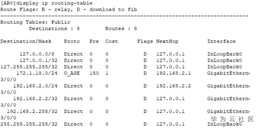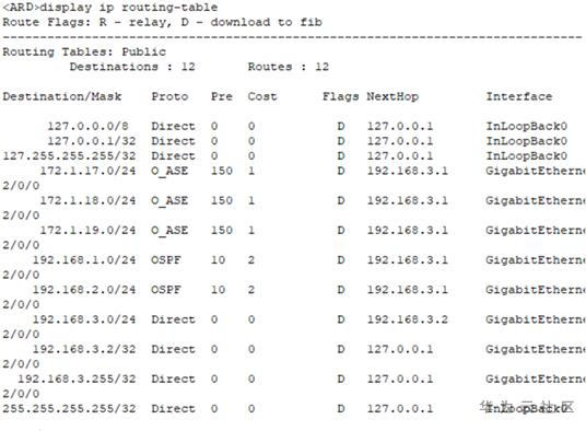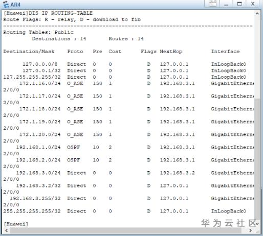 (2)配置路由策略前查看AR4的IP路由表,可以看到AR4的本地核心路由表中,接收了AR2发送的所有路由