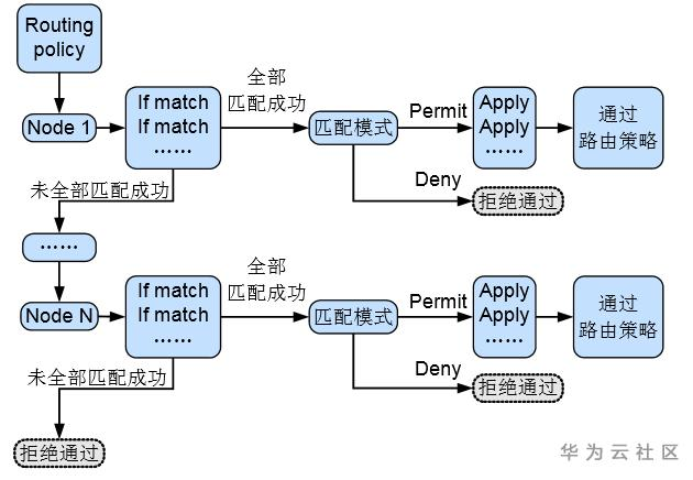 一个路由策略中包含N(N>=1)个节点(Node)。路由进入路由策略后, 按节点序号从小到大依次检查各个节点是否匹配。匹配条件由If-match子句定义,涉及 路由信息的属性和路由策略的6种过滤器。 当路由与该节点的所有If-match子句都匹配成功后,进入匹配模式选择,不再匹配其他 节点。匹配模式分permit和deny两种: l permit:路由将被允许通过,并且执行该节点的Apply子句对路由信息的一些属性 进行设置。 l deny:路由将被拒绝通过。 当路由与该节点的任意一个If-match子句匹配失败后,进入下一节点。如果和所有节点 都匹配失败,路由信息将被拒绝通过。