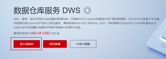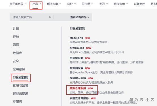 登录公有云,选择“产品”-->“EI企业智能”-->“数据仓库服务”