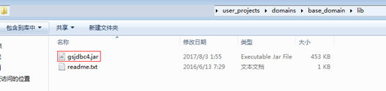 将gsjdbc4.jar驱动包上传至weblogic域中,上传至如下路径:Weblogic安装路径\ user_projects\domains\base_domain\lib