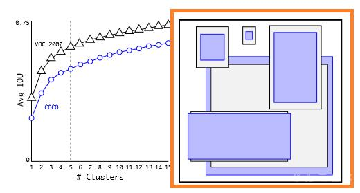 YOLOv1仅提供两种先验框,因此在目标识别过程中有一定的局限性,因此YOLOv2在v1的基础上提出了聚类提取先验框,如下图所示的五种候选框,它们的大小由聚类先验值决定。