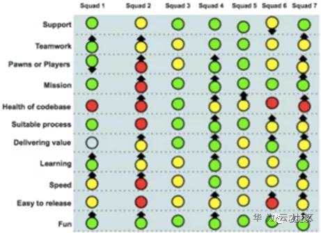 当然。如果您作为领导者想查看模式和趋势,以了解应该将精力集中在哪里,那么这将非常有价值。上图显示了Spotify中的真实示例。例如,这有助于领导者和团队确定工作的优先级,以使其易于发布。第4小队是在两周前成立的,所以他们的自我意识可能真的很低,因为一切看上去都很绿色。第2小队似乎在挣扎很多。因此,这两个小队得到了额外的支持和照顾。