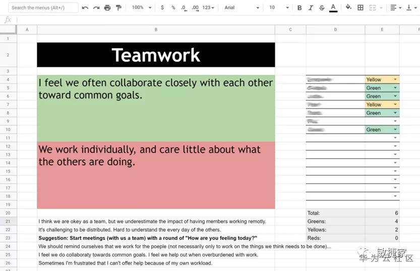 在一起做这件事时,我要求人们用绿色,黄色或红色的便利贴来投票。然后,我收集便签纸并将其放在白板上。在与远程成员一起为研讨会提供便利时,我准备了一个Google Spreadsheet,然后请与会人员对文档进行投票。在下面的屏幕快照中,您可以同时看到团队成员的投票以及在第4步之后的讨论中捕获的评论。