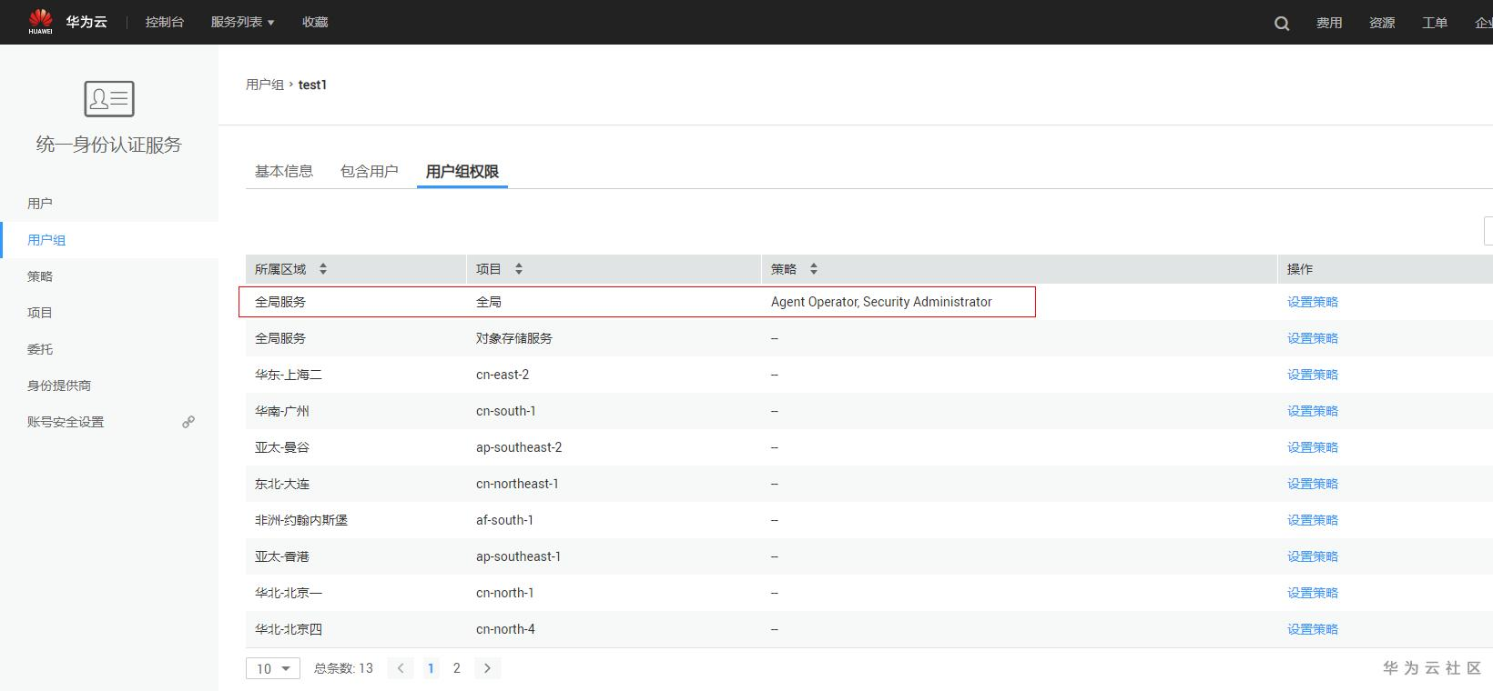 步骤 1:创建账号IAMDomainA下的IAM用户userB,并授予Security Administrator和Agent Operator权限(全局服务-全局项目)。