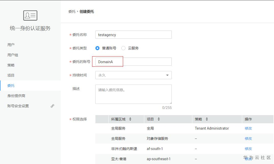 委托类型选择“普通账号”,委托的账号填写“DomainA”。