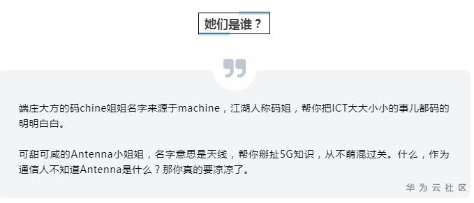 【摘要】 5G到底是个啥?真的只比4G多1G?遇上5G的各行各业会产生什么变化?连接万物的智能未来到底长什么样?天降华为小姐姐,5G知识帮帮忙码chine和Antenna两位通信美少女合体开讲带你认识那些从前我们想都不敢想的科技大小事儿!