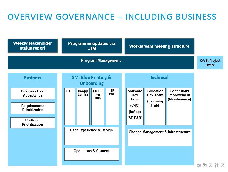 除了技术团队,还有一个超大的业务组织来支持软件的研发和运营。在第一层,经理们带领一个小团队来进行特性的优先级排序、编写蓝图、执行用户验收测试并启用功能。在第二层,又有一个团队专门负责整个产品组合、需求排序以及业务方用户验收。在第三层,是由三个项目集经理组成的项目集管理,一个来自业务(Sys Digital),一个来自Sys IT,还有一个来自Sys Education的项目总负责人。另外,还有一个支持项目集管理的项目和质量管理办公室。为了跟踪研发和业务的进度,每周还有工作流周会,干系人状态周报,以及从项目办公室汇集到管理团队的书面项目集更新。