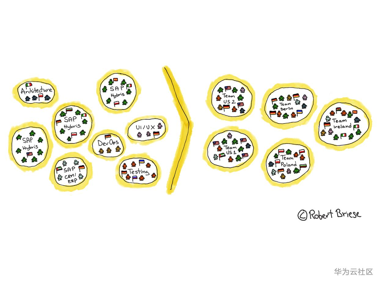 一个非常棘手的已有约束是Sys的IT部门没有任何研发工程师有SAP Hybris Commerce Suite的经验。于是他们聘请了一家专长于此的公司,为他们提供了散布在欧洲各个地方的工程师。然而,就像我们将看到的那样,这极大地影响了团队的建立。