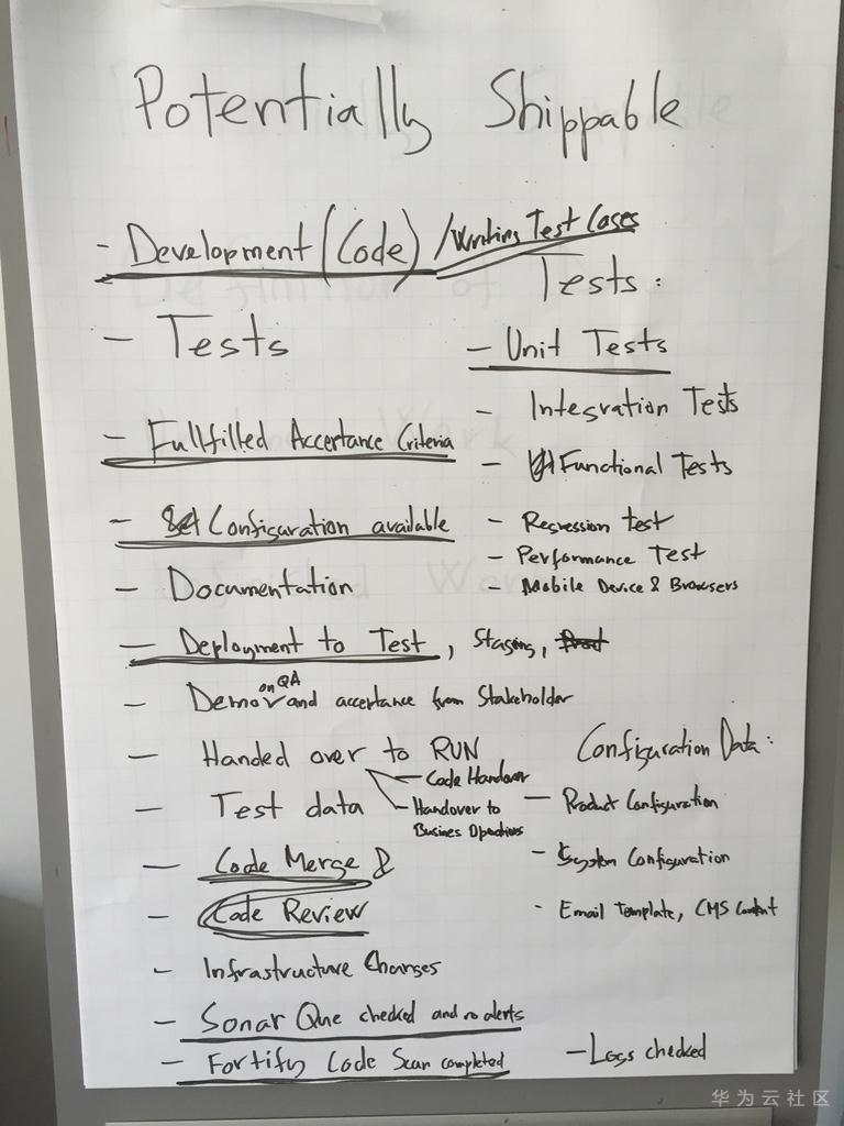 图7中划线的条目是大家一致同意放进初始"完成的定义"中的条目。其他都算作"完成之外的工作”,即不在"完成的定义"中但也是交付产品需要满足的条件。开始时这个"完成之外的工作"非常多,而我们最终目的是让所有在"完成之外的工作"中的条目最终都包含在"完成的定义"中。在随后的"发布Sprint"章节我会解释我们是怎样处理这些"完成之外的工作"的。随着时间的推移,我们通过整体回顾会议渐渐扩展了这个初始"完成的定义”。