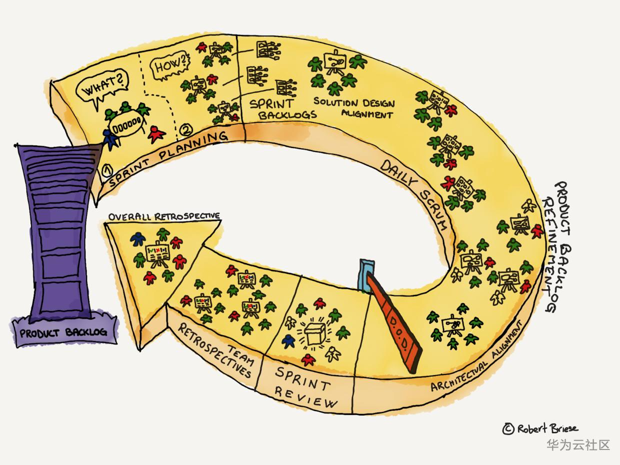 我们所有团队都从两周的Sprint开始:所有团队同时开始和结束一个Sprint(见_LeSS规则:同产品级的Sprint_)。