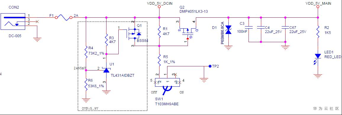 采用5V2A直流电源供电,CON2是电源接口,SW1是电源拨码开关。