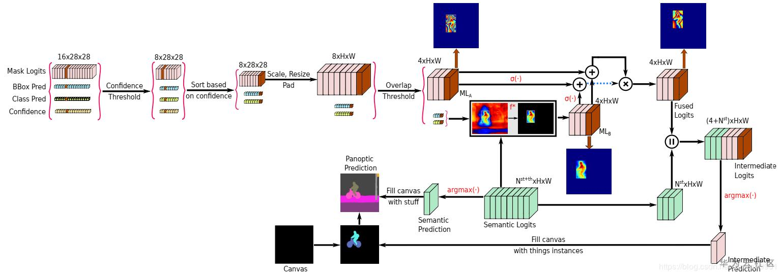 为了获得全景分割输出,我们需要融合语义分割头和实例分割头的预测。然而,由于它们之间固有的重叠,融合这两种预测并不是一项简单的任务。因此,我们提出一种新的全景融合模块,以自适应的方式解决上述问题,以充分利用两个头的预测一致。图4显示了我们的全景融合模块的拓扑结构。我们从网络的实例分割头获得一组对象实例,其中对于每个实例,我们都有其对应的类预测,置信度得分,边界框和掩码logit。首先,我们分两个阶段减少预测对象实例的数量。我们首先丢弃置信值小于某个置信值阈值的所有对象实例。然后,我们将每个对象实例的28×28掩码模型调整为零填充并缩放为与输入图像相同的分辨率。随后,我们根据各自的置信度得分对类别预测,边界框和掩码模型进行排序。在第二阶段,我们检查每个排序后的实例掩码模型是否与其他对象实例重叠。如果重叠高于给定的重叠阈值,我们将丢弃其他对象实例。