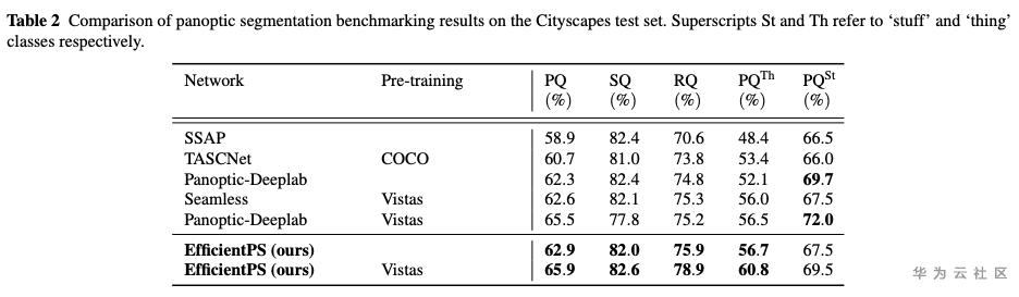 在Cityscapes语义分割基准和Cityscapes实例分割基准中,EfficientPS也在已发布的方法中排名第二。