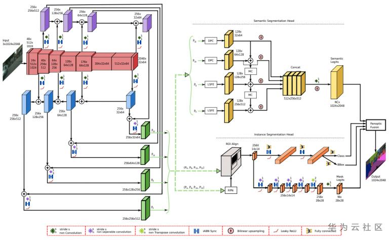 提出的EfficientPS体系结构如图示,该体系结构由一个共享主干和双向FPN,并行语义和实例分割头以及随后的全景融合模块组成。 共享主干网络建立在EfficientNet架构和我们新的双向FPN上,该双向FPN支持双向信息流。 实例分割头基于改进的Mask R-CNN拓扑,结合了提出的语义分割头。 最后,两个头部的输出在我们的全景融合模块中融合,以产生全景分割输出。