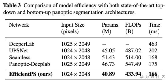 在 Cityscapes 数据集上,EfficientPS 排名第一,并且远远超过了之前的SOTA,同时参数更少,计算量更少,推理时间更快。