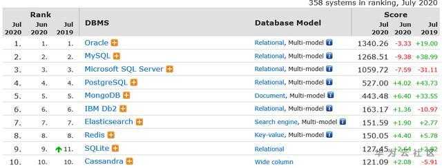 可以看到,前十的数据库基本变化不大,其实,即使从更大的时间范围,比如最近几年来说,也没有剧烈的变化,因为数据库毕竟举足轻重,软件开发企业也不会贸然改变自己的开发方向。