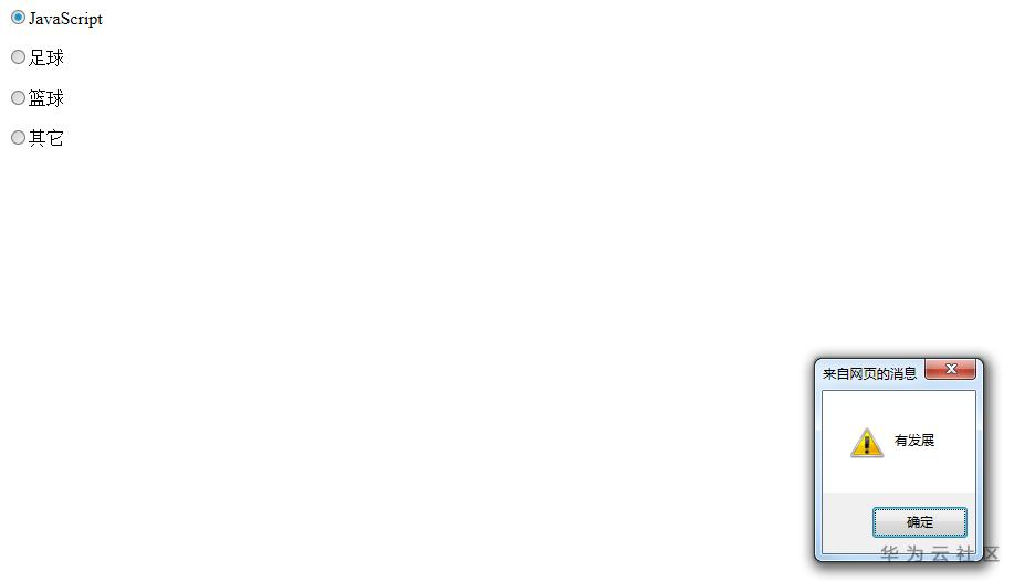 <form> <p><input type="radio" name="browser" onclick="hobby(this.value)" value="js" id="js"><label for="js">JavaScript</label></p> <p><input type="radio" name="browser" onclick="hobby(this.value)" value="football" id="football"><label for="football">足球</label></p> <p><input type="radio" name="browser" onclick="hobby(this.value)" value="basketball" id="basketball"><label for="basketball">篮球</label></p> <p><input type="radio" name="browser" onclick="hobby(this.value)" value="other" id="other"><label for="other">其它</label></p> </form>