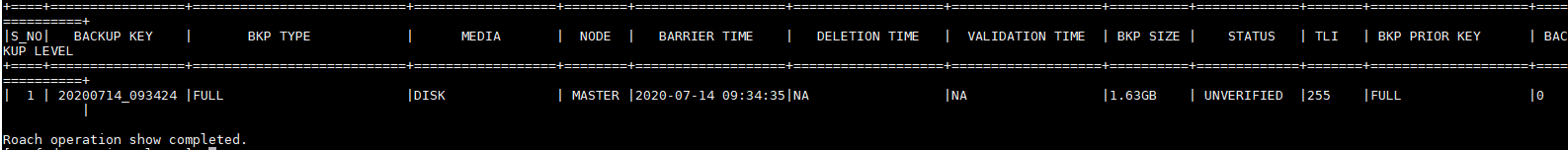 show---以列表形式显示可用备份、备份类型、将用于特定backup key恢复的备份,回显信息中包括BACKUP KEY、BKP TYPE、BARRIER TIME、DELETION TIME、VALIDATION TIME、STATUS、TLI、BKP PRIOR KEY、BACKUP LEVEL等关键信息。