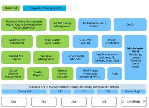 华为云MCP容器多云平台在K8s多集群技术领域属于较早也是实现较为全面的产品,而同时华为云作为KubeFed社区项目的发起者与领导者,将在未来致力于完善现有KubeFed的功能集,并且实现K8s多集群技术的标准化。下图描述了K8s多集群技术的全景,目前华为云已经在KubeFed自身以及周边关联的多个技术领域开展了相关工作。