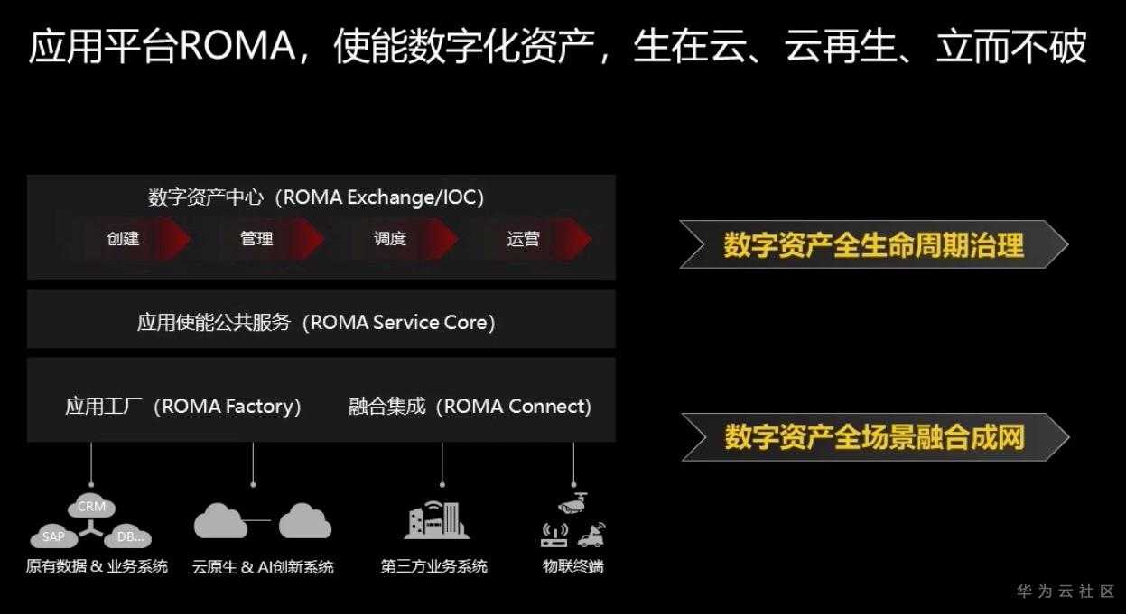整体来说:华为云应用平台ROMA来自华为自身流程IT近三十年的实践,沉淀了华为长期服务政企客户的经验,聚焦数字化资产治理、使能行业和大型政企资产复用和数字化转型,让政企和行业的数字资产生在云上(开发、集成在云上),也在云上再生(在云上持续共享变现),即服务数字经济,又领先企业和市场的战略格局,同时生态建设先行,从而重塑传统政企上云的路径——“条条大路”通向云端。(文/宁川)