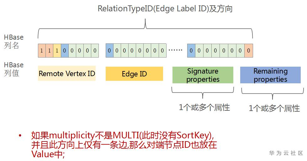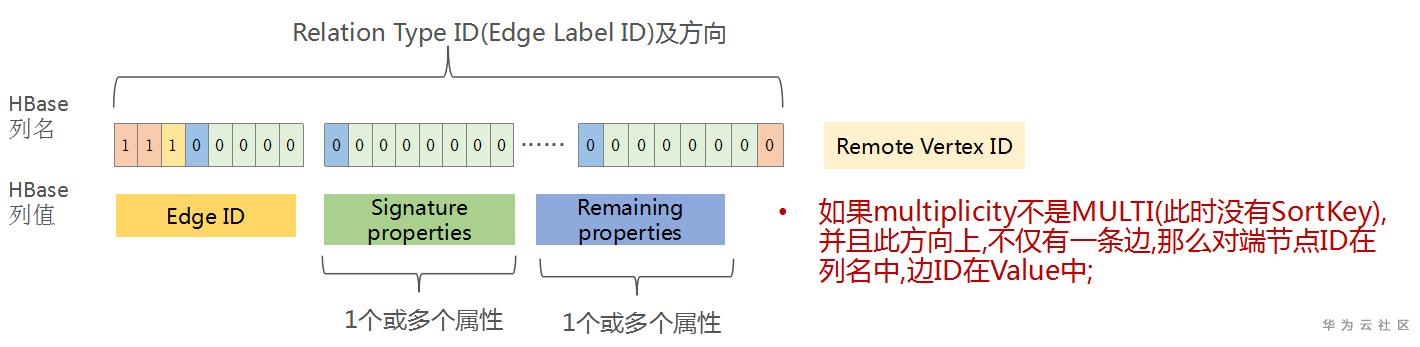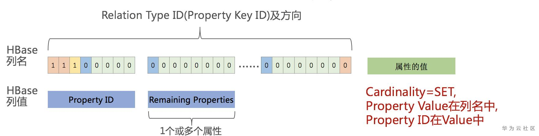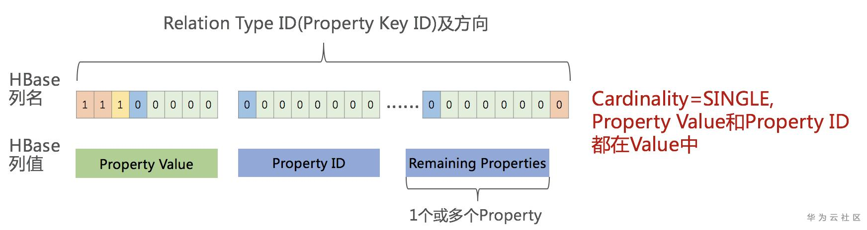 HBase的列名只存储Property Key的ID及方向。具体的Property Value值以及Property ID(JanusGraph为每一个Property分配的唯一ID),都存放在Cell的Value中。另外,如果该Property还有额外的Remaining properties,也会放在Value中。Remaining properties一般不使用,仅在一些特殊场景下,用于为该Property记录更多的附加信息(比如存储元数据Edge Labe的定义等)。