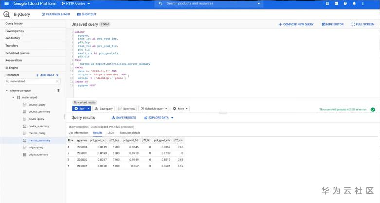 通过官方预置(chrome-ux-report.materialized.metrics_summary)的数据,书写简单的SELECT语句,可以从时间、设配型号、国家等多维度获取用户的访问记录、并对LCP、FID、CLS等关键指标进行分析