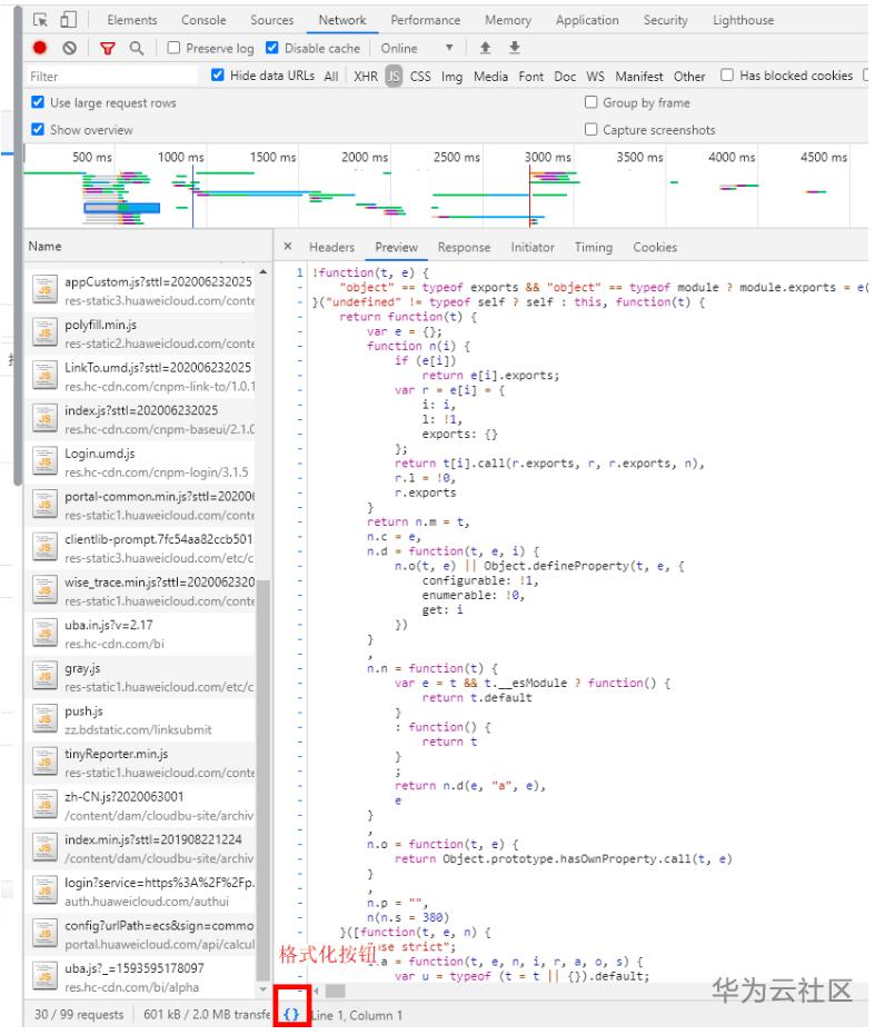 点击Network->JS便能查看加载的JS文件,左下角的{}按钮可以格式化JS文件,使文件更易读