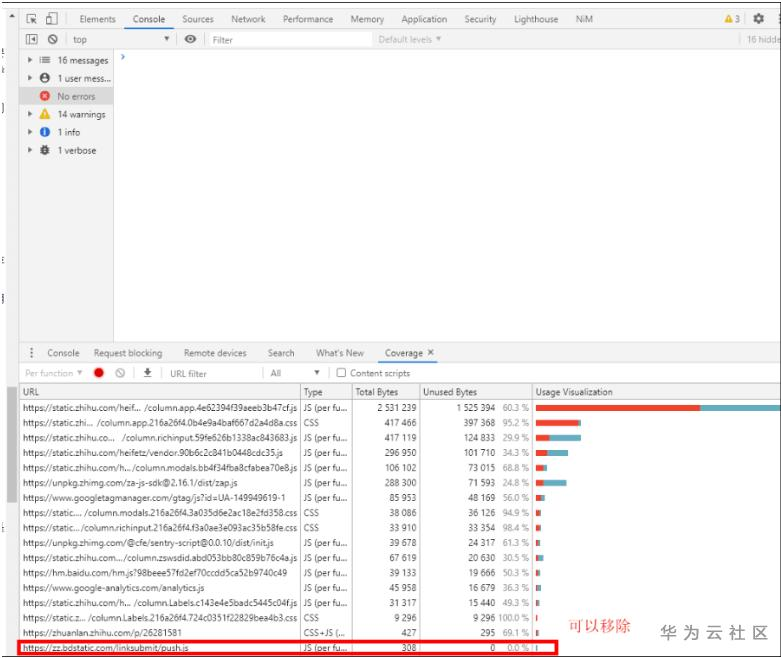 查看JS代码的覆盖率,如果文件覆盖率低,说明该文件未使用代码比例很高。可以通过精简无用代码或者懒加载优化