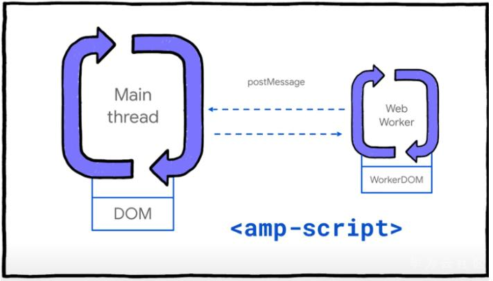 <amp-script>在2018年引入的WorkerDom,是Main thread的副本,web开发者只会修改WorkerDom,当WorkerDom修改时,会postMessage通知主Dom,同步修改实现修改真实Dom。当真实Dom修改时,也会postMessage去同步WorkerDom。<amp-script>存在开发者可以在主线程之外去操作dom。