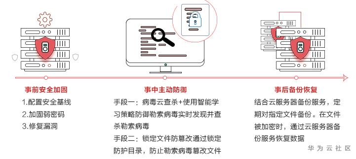 防勒索病毒是一个长期而持久的过程,华为云HSS事前(安全加固)、事中(主动防御)、事后(备份恢复)三部曲,为您抵挡勒索病毒入侵,营造主机资产安全运行环境。