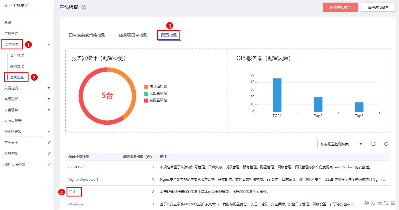 步骤 1 进入“基线检查”页面,选择“配置检测”页签,查看配置检测详情,例如:SSH采用了不安全的加密算法。