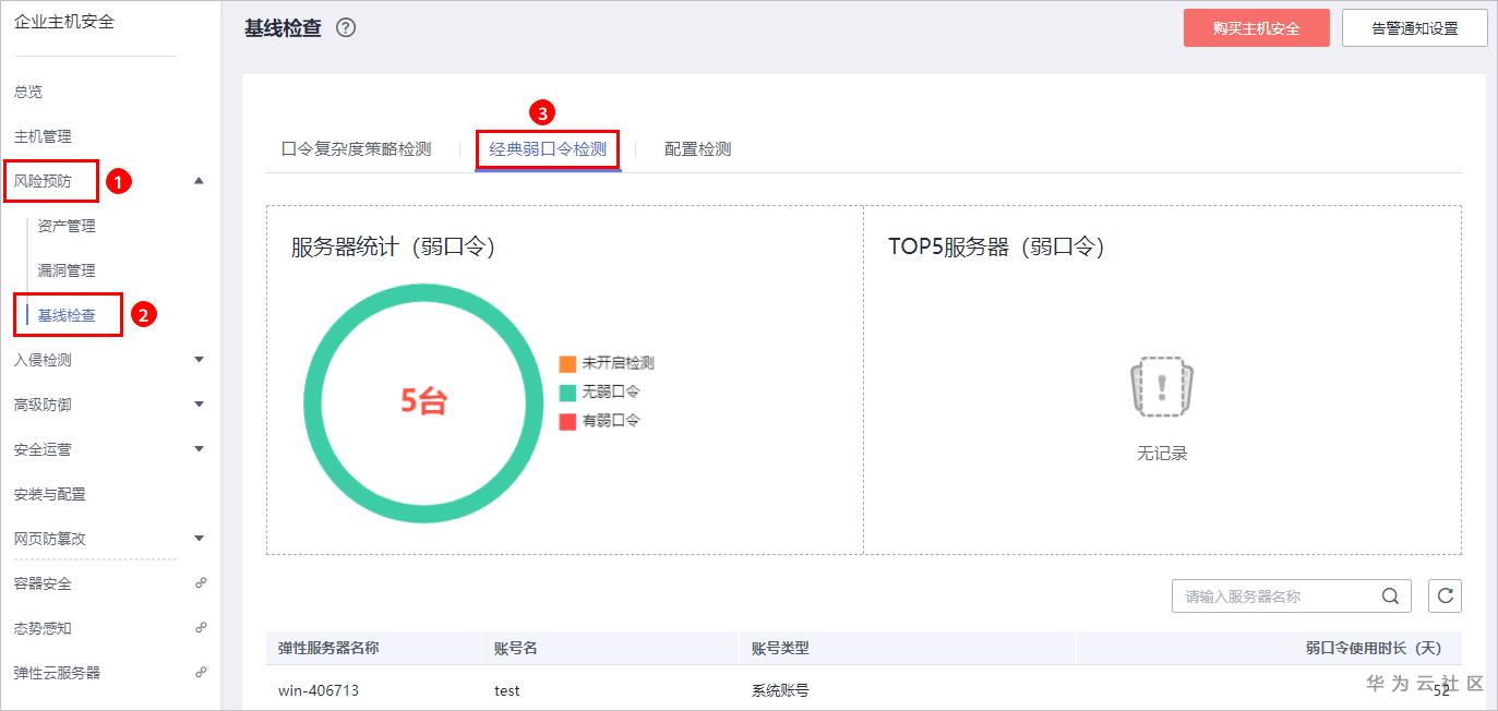 步骤 1 选择“安全 > 企业主机安全”,进入“基线检查”页面,加固弱密码。