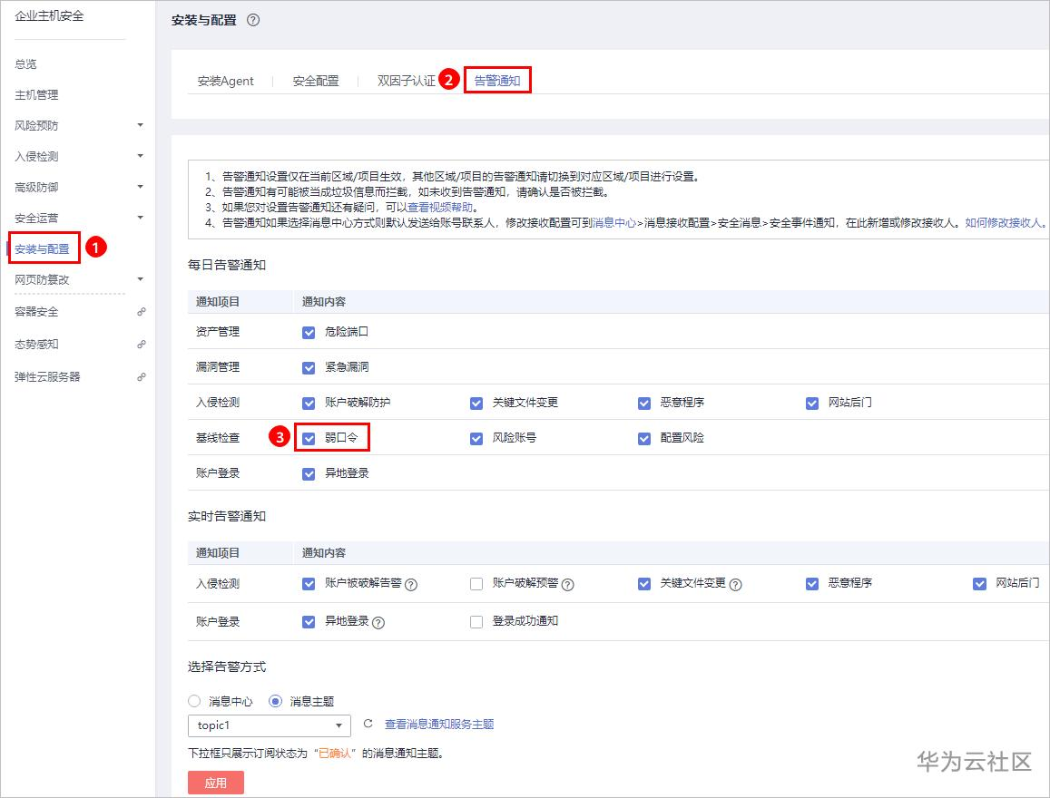 步骤 4 进入“告警通知”页面,勾选“弱口令”,一旦检测出弱口令,您将会收到告警通知。